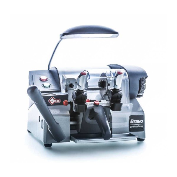 Bravo Professional es la duplicadora mecánica para llaves planas para cilindros y vehículos y llaves en cruz. Bravo Professional está equipada con mordazas rotativas de cuatro lados con mando de control dinamométrico, palpador mecánico con regulación centesimal mediante tuerca y motor fresa de una velocidad.