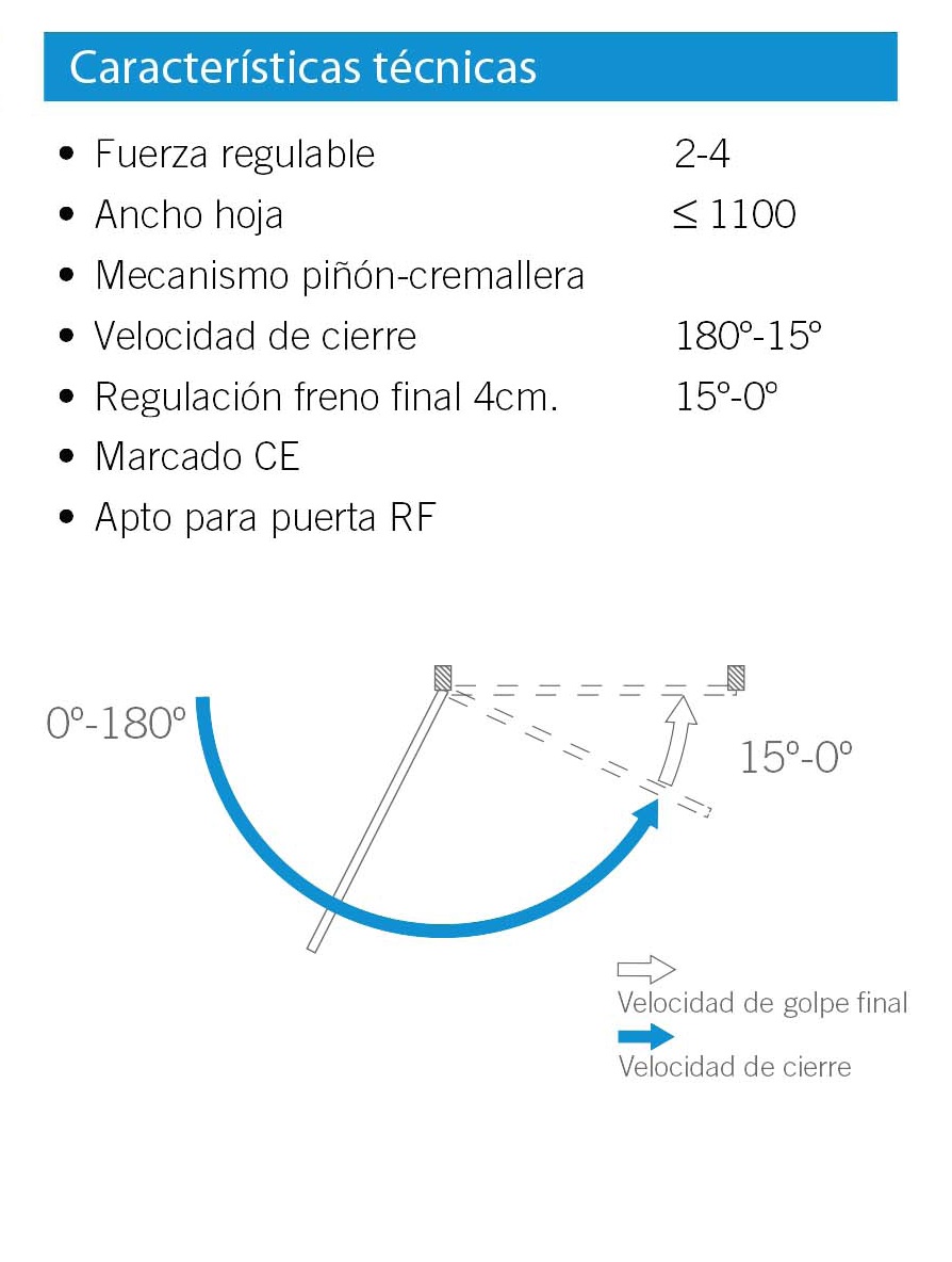Cierrapuertas sin sistema de retención, con una regulación de golpe final y regulación de la velocidad de cierre.