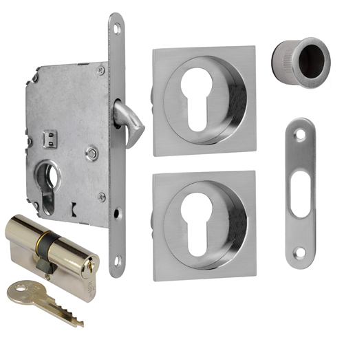 Kit para puertas correderas estándar compuesto por cerradura, bocallave, dedal y cerradero.