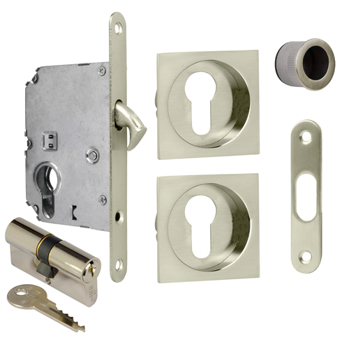 Kit para puertas correderas estándar compuesto por cerradura, bocallave, dedal y cerradero.