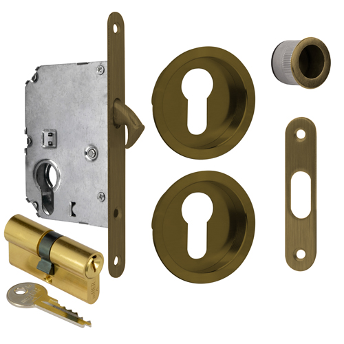 Kit para puertas correderas estándar compuesto por cerradura, bocallave, dedal y cerradero.