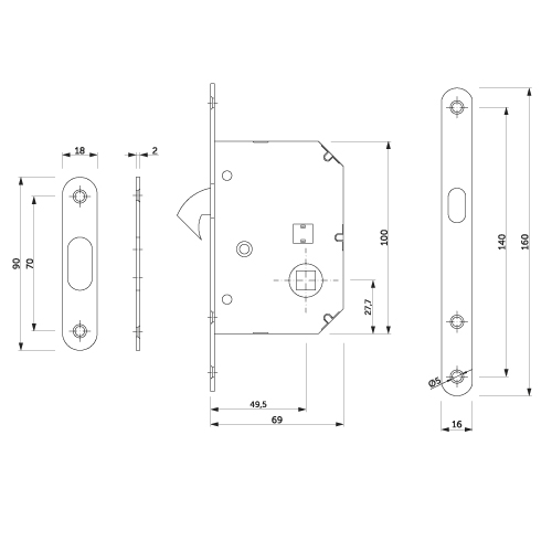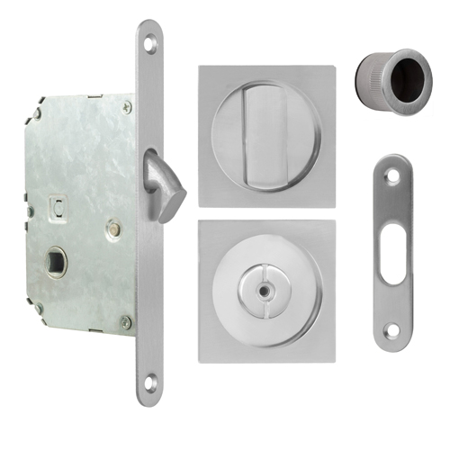 Kit para puertas correderas estándar, compuesto por cerradura, condena, dedal y cerradero.