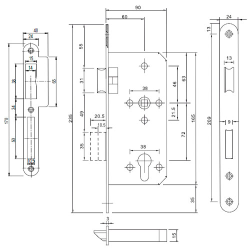 CERRADURA INTHER SUPRA 549/F20/60 C/R INOX. SIN CILINDRO