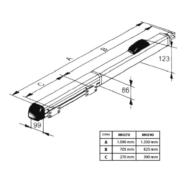 Alimentación motorAlimentación motor 230 Vac 230 VacAlimentación motor 230 VacDimensión máxima puertaDimensión máxima puerta 3,5 mts 3,5 mtsDimensión máxima puerta 3,5 mtsFuerza de empujeFuerza de empuje 1.850 N 1.850 NFuerza de empuje 1.850 NPotencia motorPotencia motor 250 W 250 WPotencia motor 250 WCorriente absorbidaCorriente absorbida 1 A 1 ACorriente absorbida 1 AGiro motor / RIDGiro motor / RID 1.400 rpm 1.400 rpmGiro motor / RID 1.400 rpmCondensadorCondensador 8 uF 8 uFCondensador 8 uFPeso motorPeso motor 9 Kg 9 KgPeso motor 9 KgCarreraCarrera 270 mm 270 mmCarrera 270 mmTemperatura de funcionamientoTemperatura de funcionamiento -25ºC / +70ºC -25ºC / +70ºCTemperatura de funcionamiento -25ºC / +70ºCLímite térmicoLímite térmico 120ºC 120ºCLímite térmico 120ºCFrecuencia de usoFrecuencia de uso 300 maniobras/día 300 maniobras/díaFrecuencia de uso 300 maniobras/díaVelocidadVelocidad 0,013 m/s 0,013 m/sVelocidad 0,013 m/sGrado de protecciónGrado de protección IP55 IP55Grado de protección IP55Finales de carreraFinales de carrera NO NOFinales de carrera NO