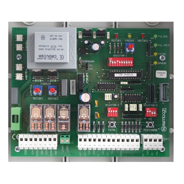 Cuadro de maniobra alimentado a 230V sin radio integrada diseñado especialmente para motores de puertas batientes de 2 hojas y basculantes.