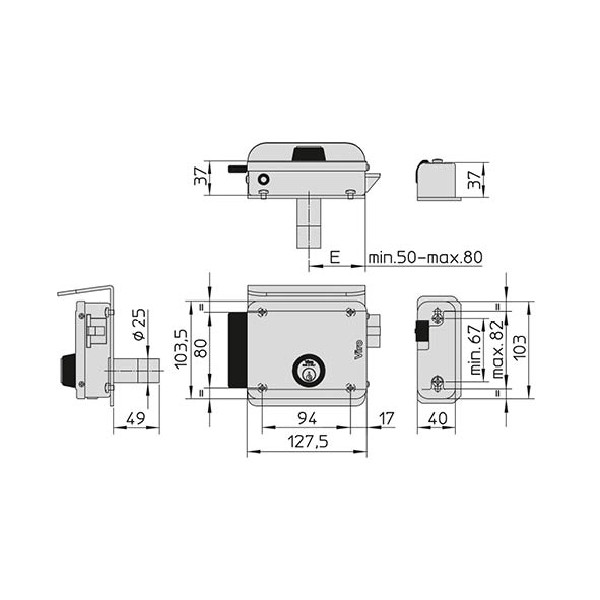 Electrocerradura VIRO de sobreponer de 12V con cilindro regulable al centro (50, 60, 70 u 80 mm)