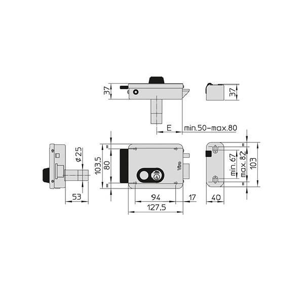Electrocerradura VIRO de sobreponer de 12V con cilindro regulable al centro (50, 60, 70 u 80 mm), con pulsador