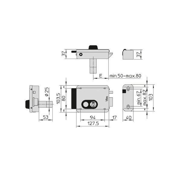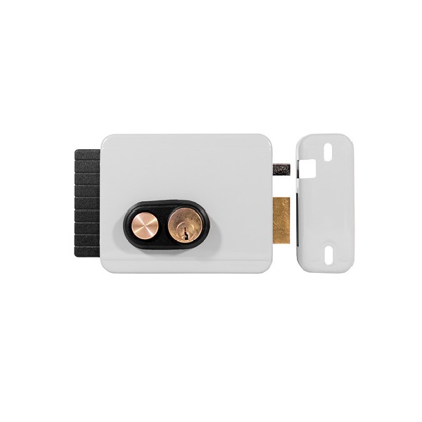 Electrocerradura VIRO de sobreponer de 12V con cilindro regulable al centro (50, 60, 70 u 80 mm), con pulsador